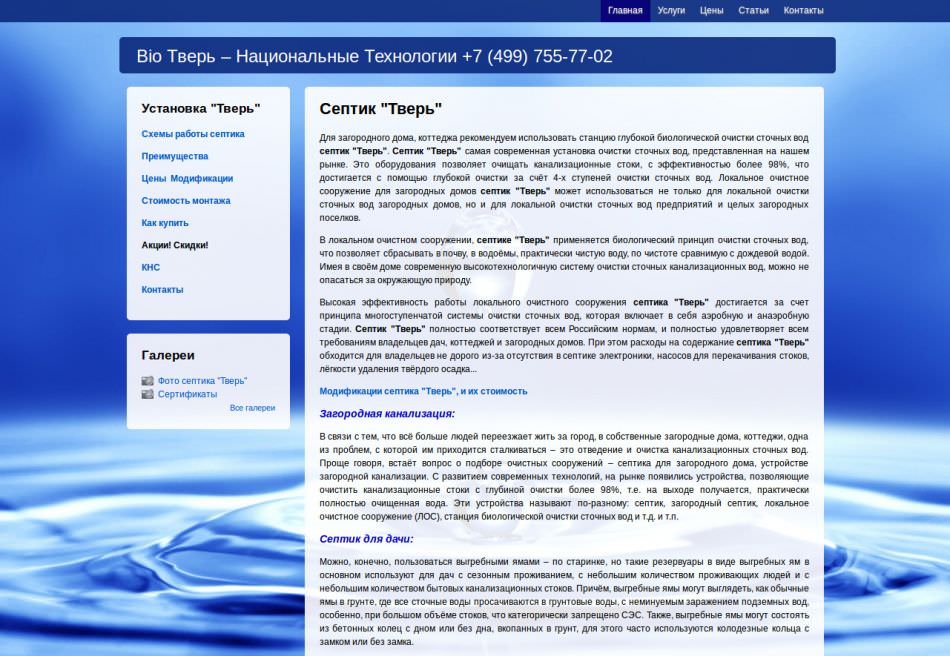Септик "Тверь" самая современная установка очистки сточных вод, представленная на нашем рынке. Это оборудования позволяет очищать канализационные стоки, с эффективностью более 98%, что достигается с помощью глубокой очистки за счёт 4-х ступеней очистки сточных вод. Септик "Тверь" полностью соответствует всем Российским нормам, и полностью удовлетворяет всем требованиям владельцев дач, коттеджей и загородных домов.