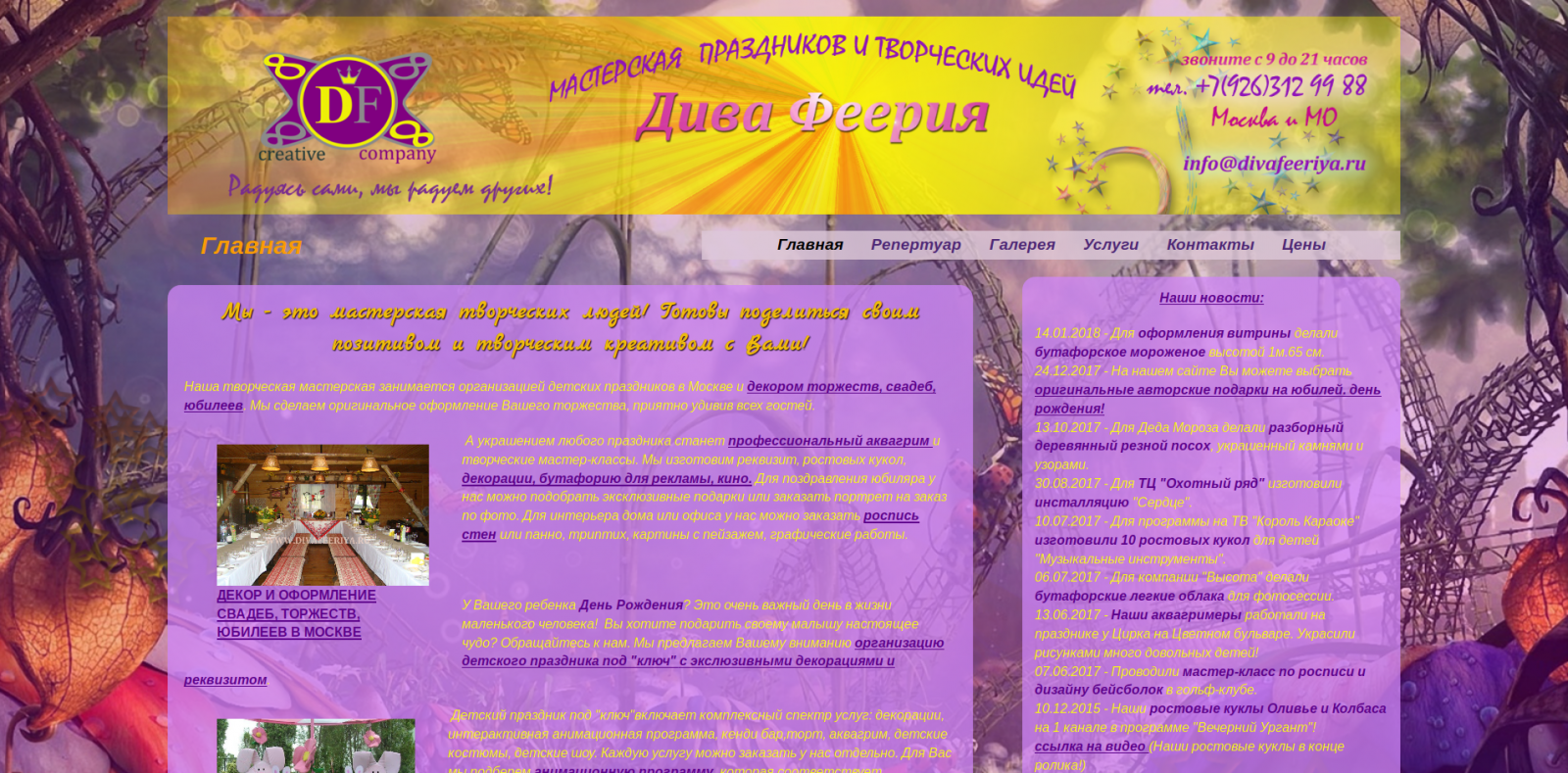 Сайт создан для творческой мастерской "Дива Феерия" занимающейся организацией детских праздников в Москве и декором торжеств, свадеб, юбилеев. Индивидуальная доработка дизайна шапки сайта и функционала меню сайта.