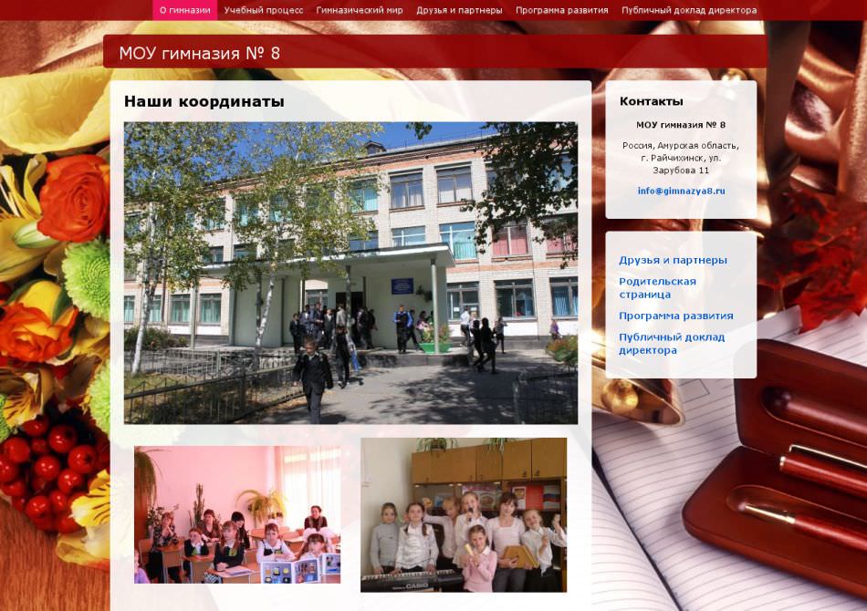 На сайте Муниципального образовательного учреждения гимназии №8 представлена полная информация о мероприятиях школы, о ходе учебного процесса, а также информация о новостях и программе развития гимназии.
