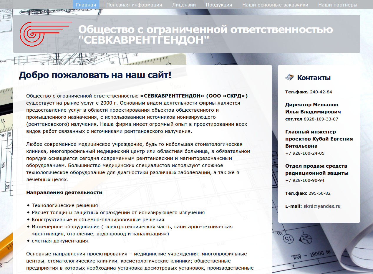 ООО "СКРД" существует на рынке услуг с 2000 г. Основным видом деятельности фирмы является предоставление услуг в области проектирования объектов общественного и промышленного назначения, с использованием источников ионизирующего (рентгеновского) излучения.