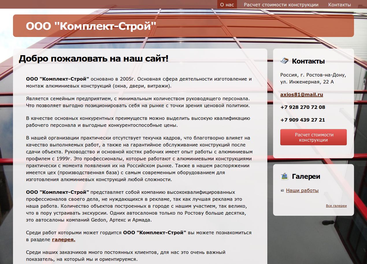 ООО "Комплект-Строй" основано в 2005г. Основная сфера деятельности изготовление и монтаж алюминиевых конструкций (окна, двери, витражи).