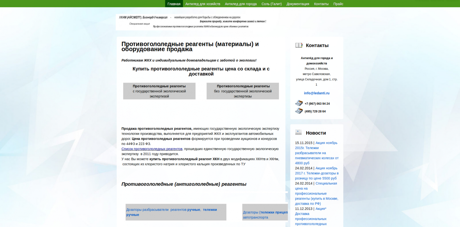 Сайт продажи противогололедных реагентов, имеющих государственную экологическую экспертизу технологии производства, выполняется для предприятий ЖКХ и эксплуатантов автомобильных дорог.