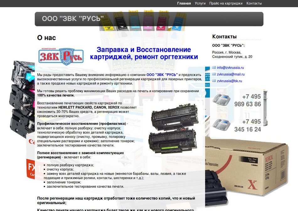 Компания ООО "ЗВК "РУСЬ" предлагает высококачественные услуги по профессиональной регенерации картриджей для лазерных принтеров, а также продаже новых картриджей и ремонту оргтехники. Восстановление печатающих свойств картриджей по технологиям HEWLETT PACKARD, CANON, XEROX.