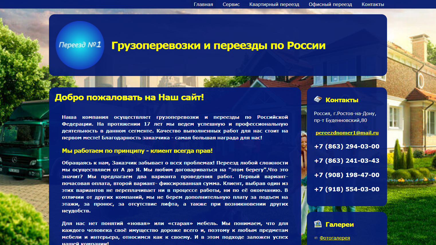 Компания осуществляет грузоперевозки и переезды по Российской Федерации. На протяжении 14 лет компания ведет успешную и профессиональную деятельность в данном сегменте. Переезд любой сложности.