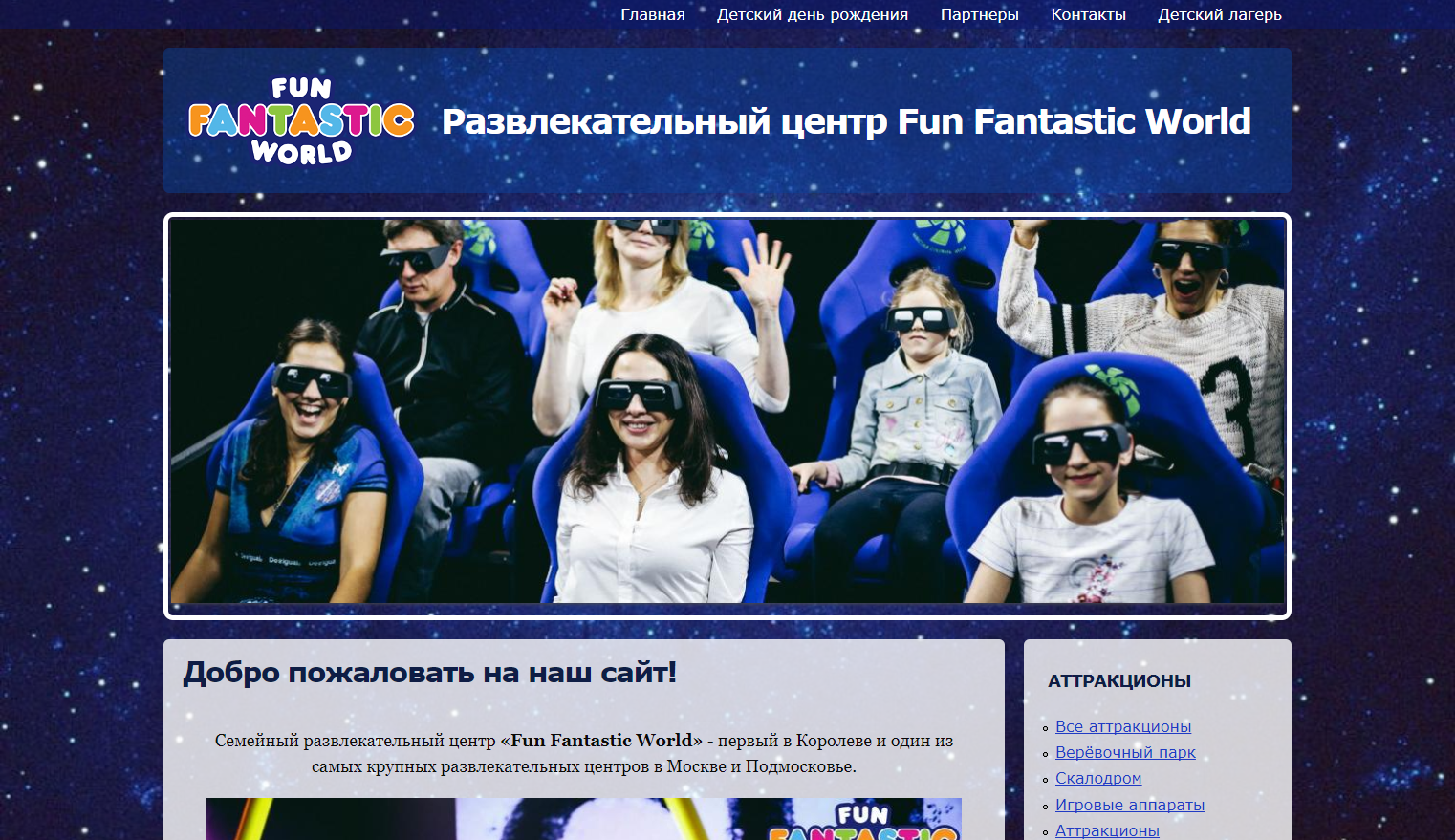 Семейный развлекательный центр «Fun Fantastic World - первый в Королеве и один из самых крупных развлекательных центров в Москве и Подмосковье. Включает в себя более 100 игровых аппаратов и аттракционов, веревочный парк, батут, скалодром, огромный игровой лабиринт, ясельная зона, 5D- кинотеатр, зеркальный лабиринт, лазерный лабиринт, бампер-машинки – лучшее место для организации праздника и семейного отдыха.