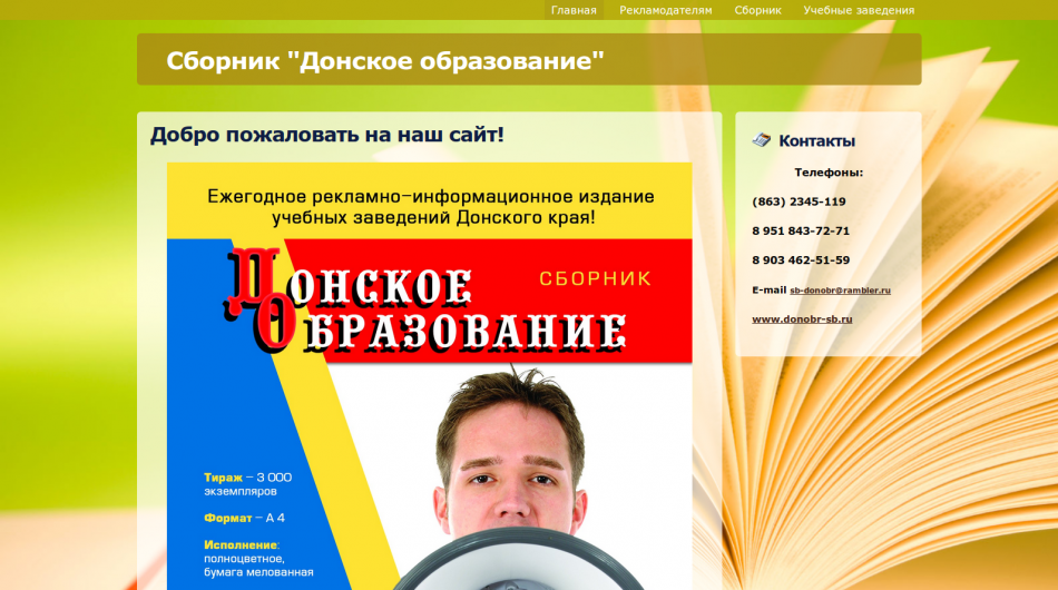 Сборник "Донское образование" выпускается в городе Ростов-на-Дону и публикует рекламу и базовую информацию учреждений системы образования.