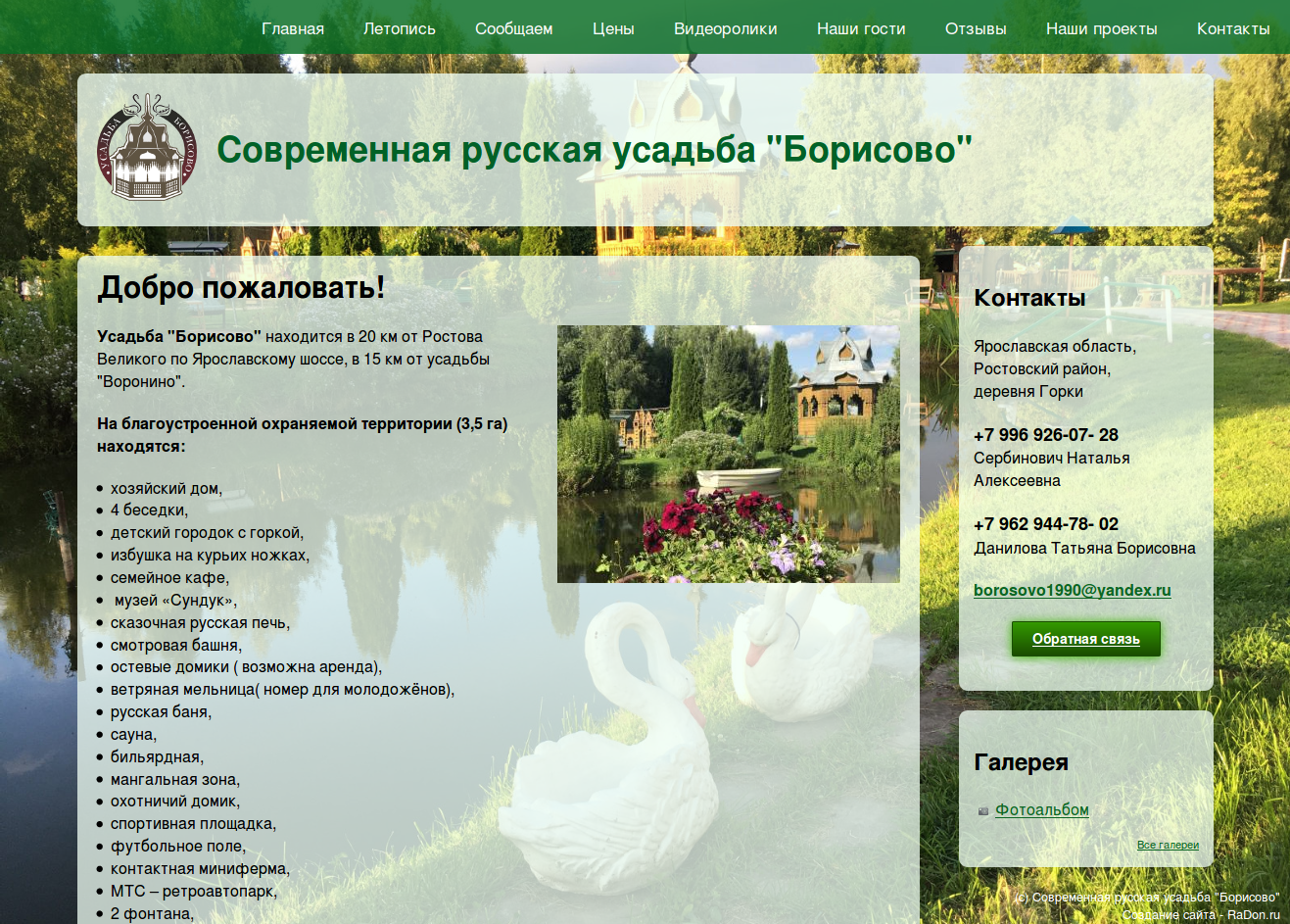 Усадьба "Борисово" находится в 20 км от Ростова Великого по Ярославскому шоссе, в 15 км от усадьбы "Воронино". На благоустроенной охраняемой территории (3,5 га) находятся: