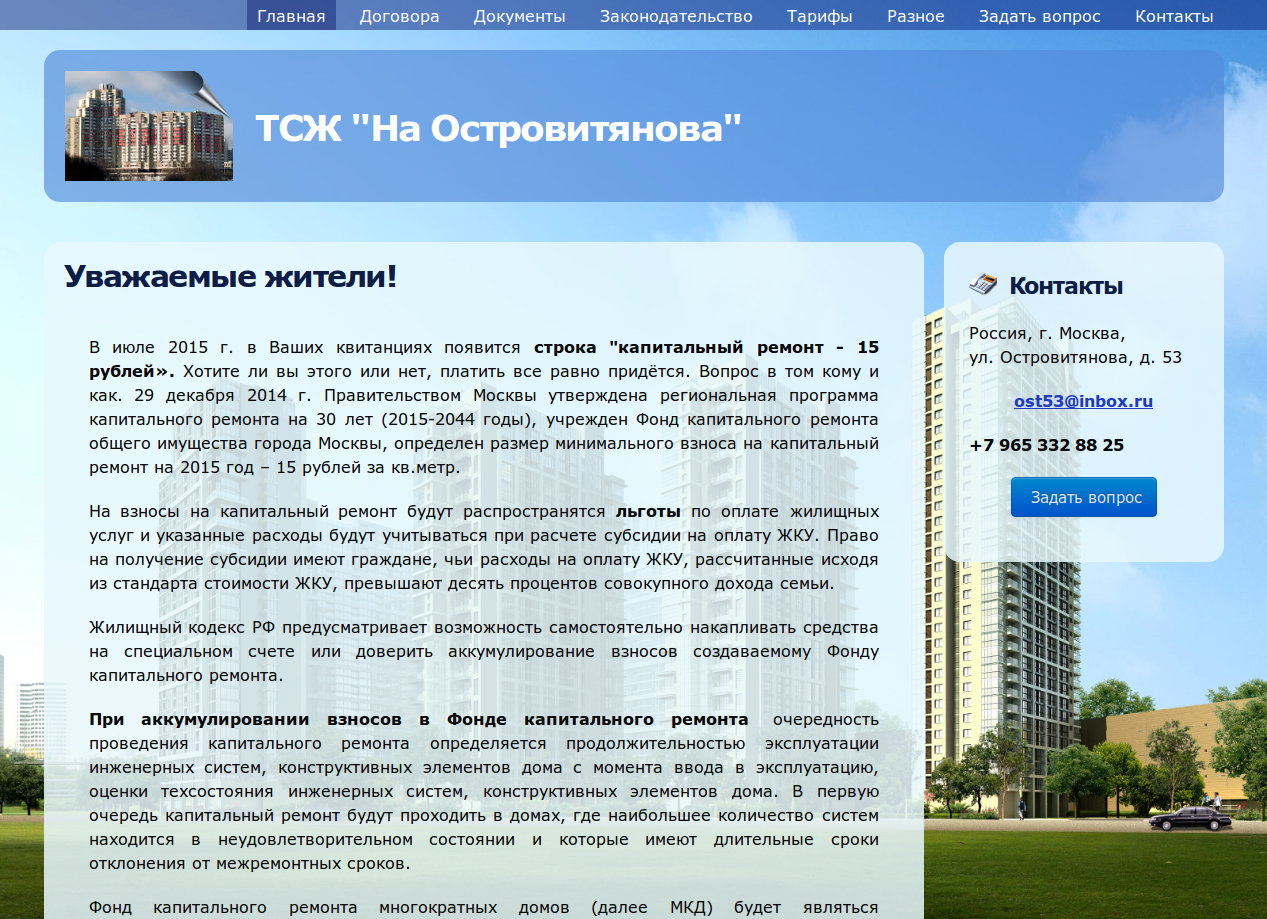 Товарищество собственников жилья "На Островитянова". На сайте представлены устав ТСЖ, документы, договоры, указаны действующие тарифы и последние изменения в законодательстве.